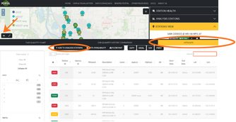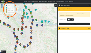 As you zoom into the map the icons will begin to disaggregate from approximate locations closer to actual locations of detection of either in-ground loops or radar detectors. (If you notice that the location is incorrect please let us know.) The numbers within each icon indicates the number of stations within that area. Once you find the station(s) of interest, click on the icon. Each time an icon is clicked, the selected icon will change color and a list of stations will show up on the right sidebar menu under "Stations View" (Fig. 2).